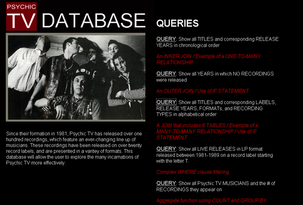 Database driven website with an emphasis on PHP/MySQL. Queries were chosen to demonstrate competency