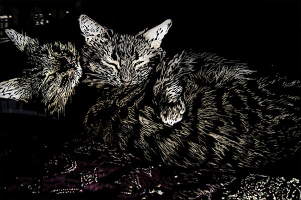 "Woodcut" technique created by using short, sharp brush strokes.