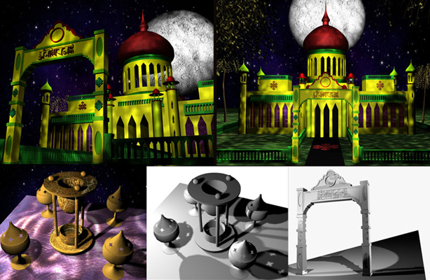 Composite layout of projects including grayscale sign and primitive objects, primitive objects with materials and lighting,