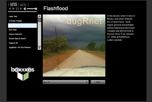Mp3 player for electronic musician DugRNet's online music label "Boxxxes." Allows user to update text, photos, and